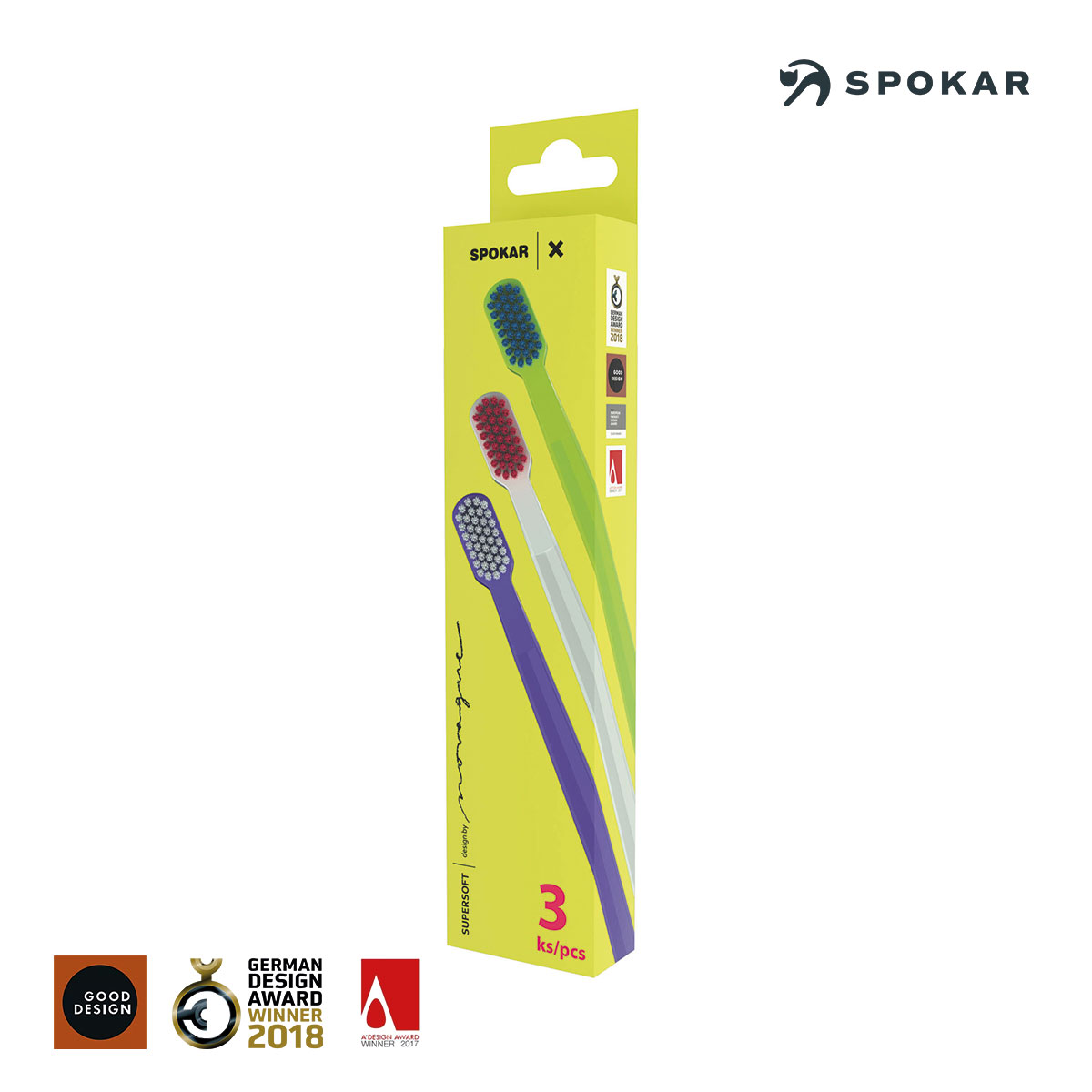 Das Design der SPOKAR X SUPERSOFT- Zahnbürste stammt vom führenden tschechischen Designer MgA. Petr Novague , der für seinen innovativen Ansatz zahlreiche internationale Auszeichnungen erhalten hat.